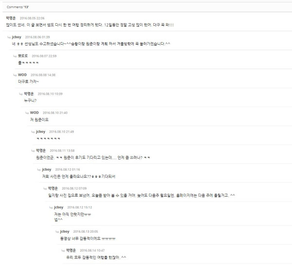 친구들아 12일동안 같이 여행다닌 것이 난 좋았다. 비록 늦게 친해진 것이 아쉽지만 그래도 서로 알게되서 난 좋았다. 너네들도 좋은 추억 남기고 갔으면 좋겠다.학교 생활 열심히 하고  겨울방학에 대구로 모이자^^ 꼭 갈게~^^